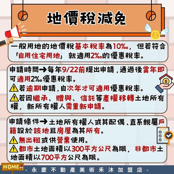 ▪︎減免須知:若符合「自用住宅用地」條件,土地所有權人需在當年09/22前向稅捐處提出申請,若逾期申請就要等到明年才可使用2‰優惠稅率喔!